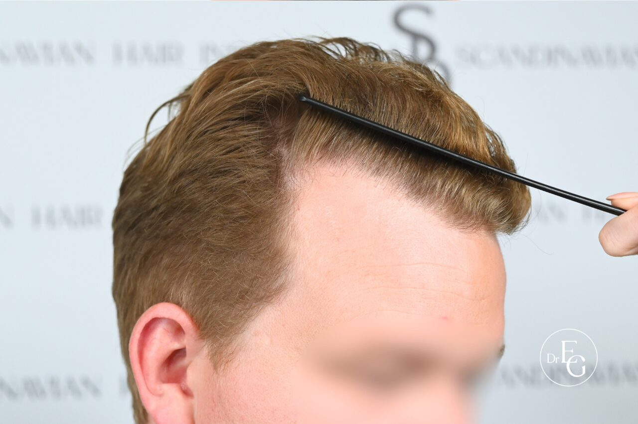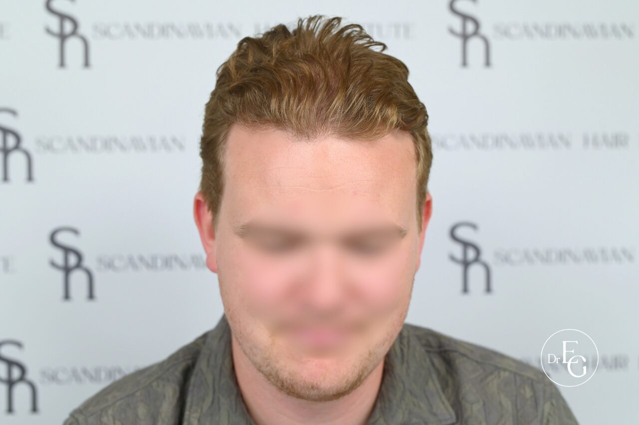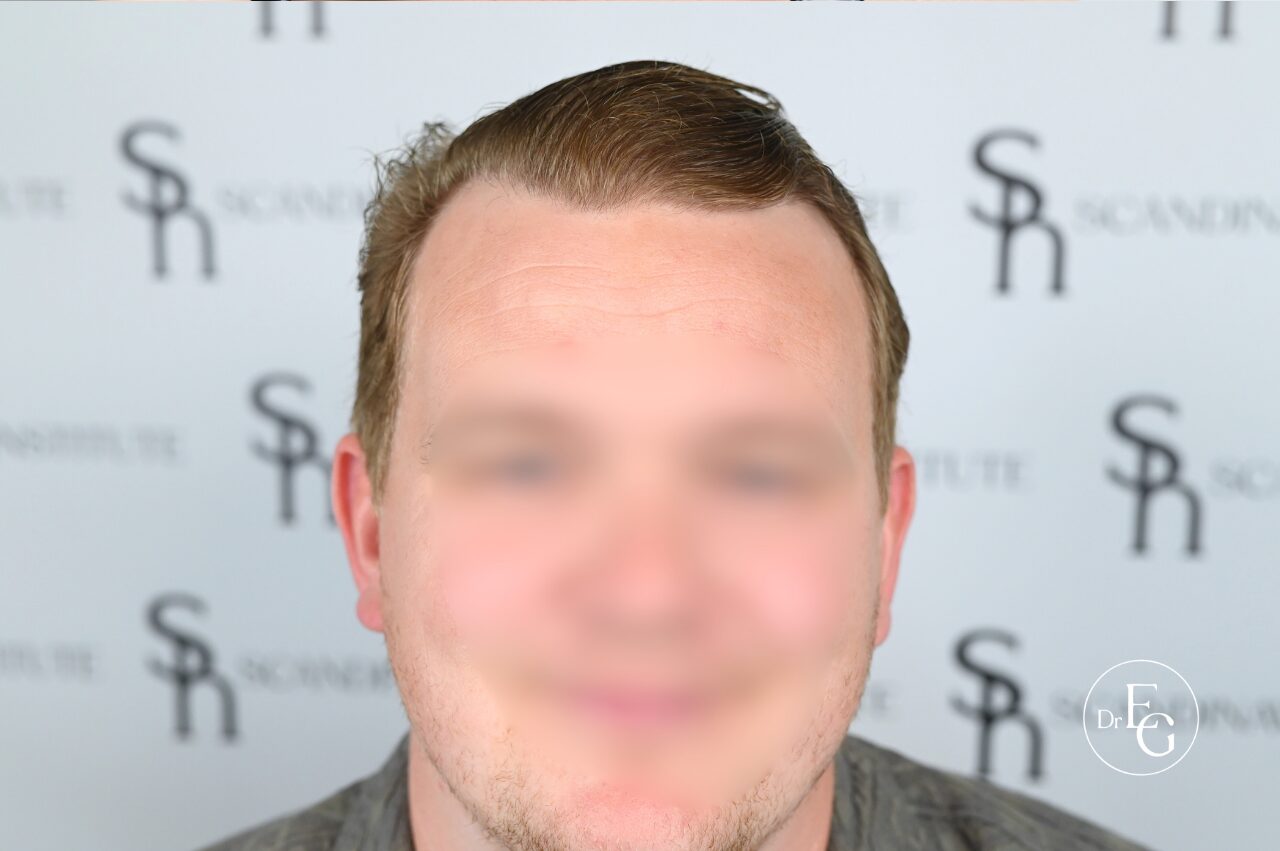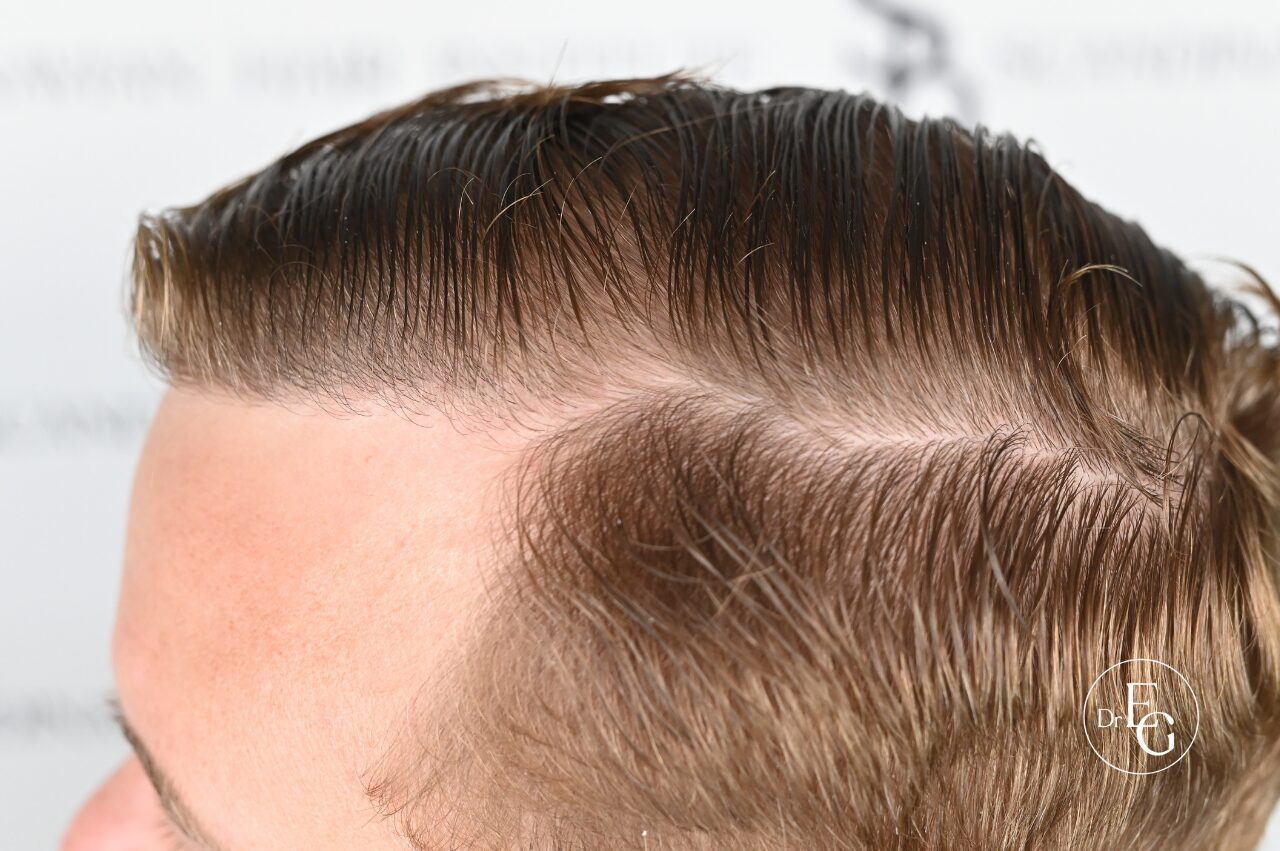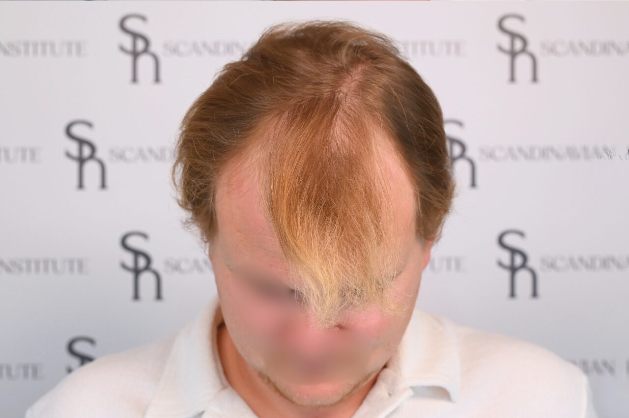 Blonde patient with deep temples, 2200 grafts, dry and wet hair.