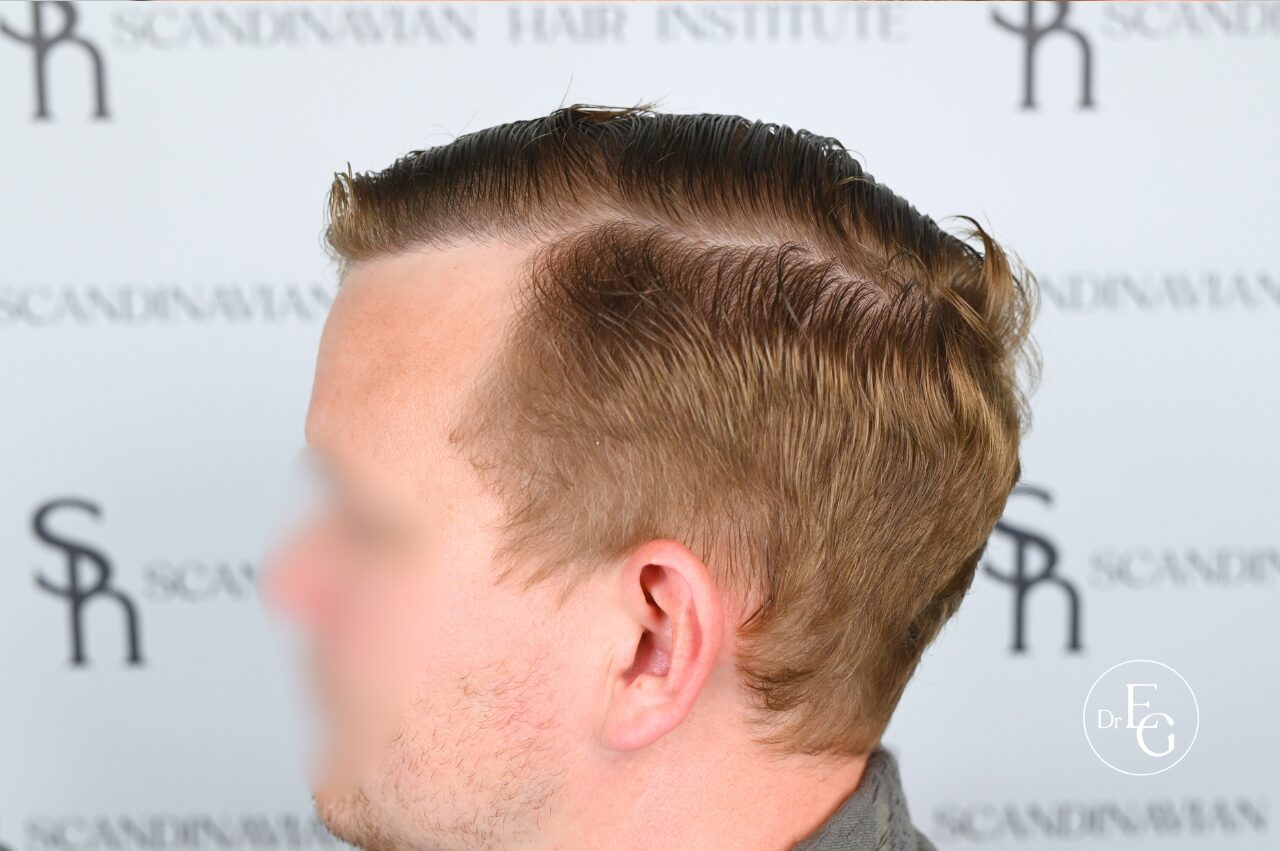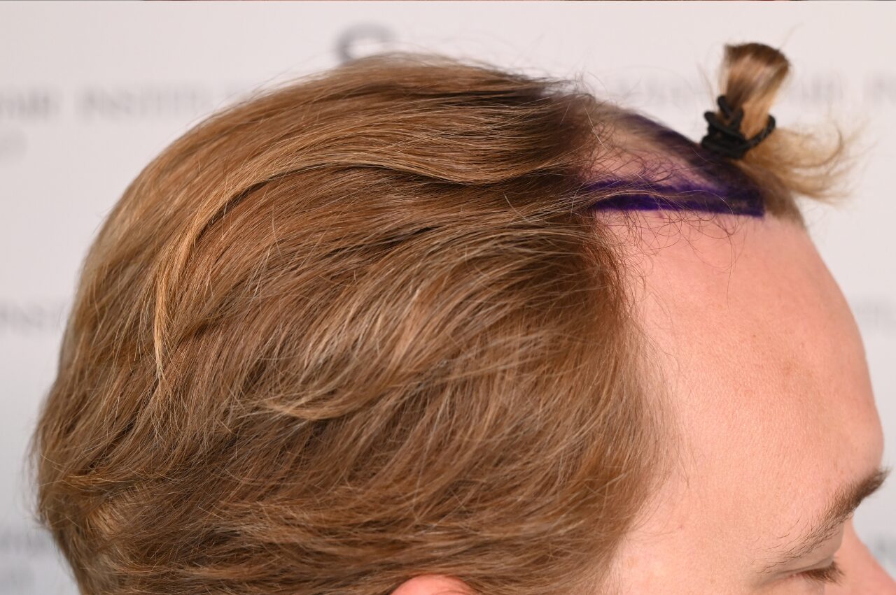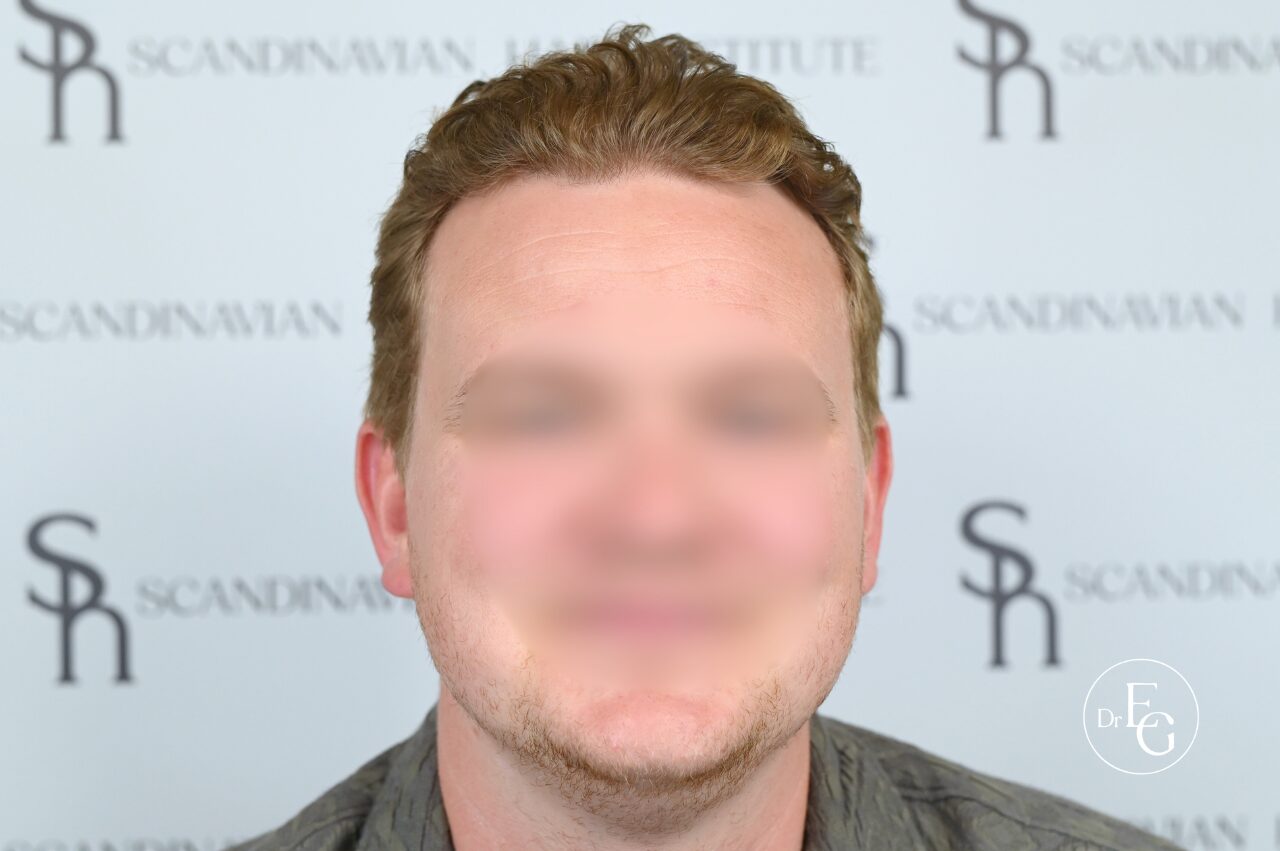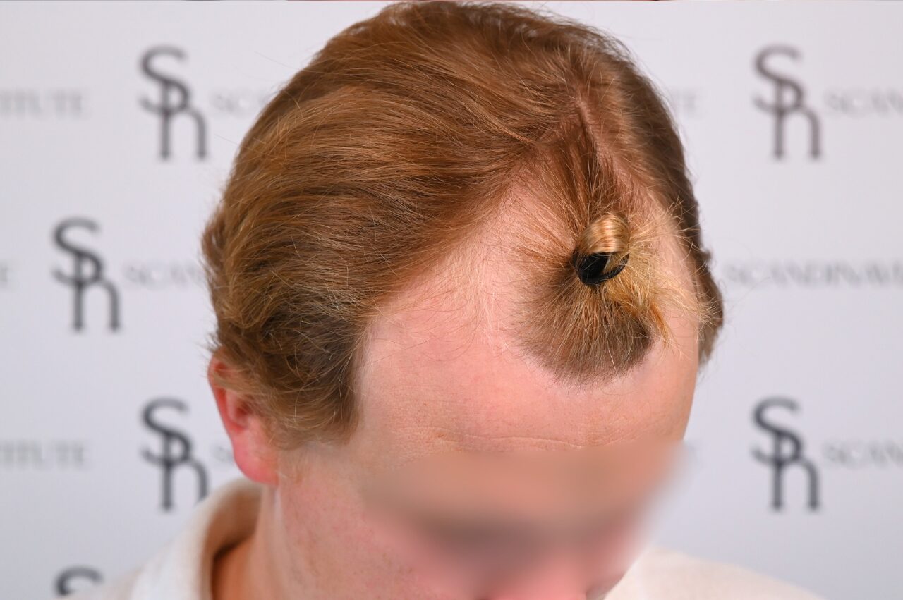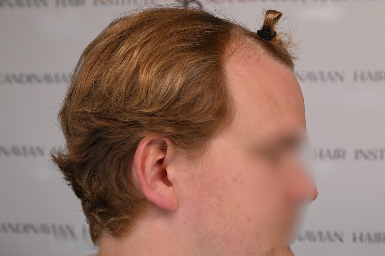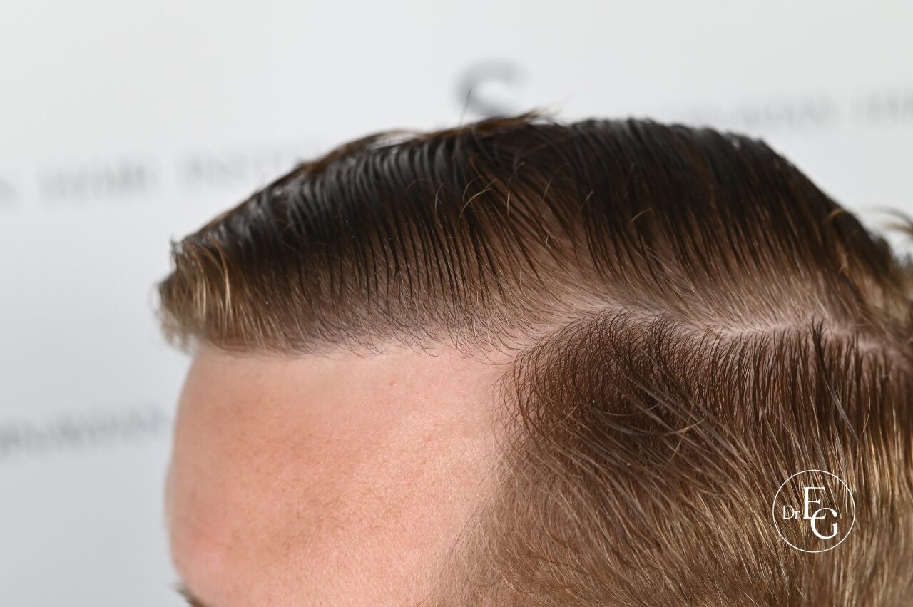 Blonde patient with deep temples, 2200 grafts, dry and wet hair.