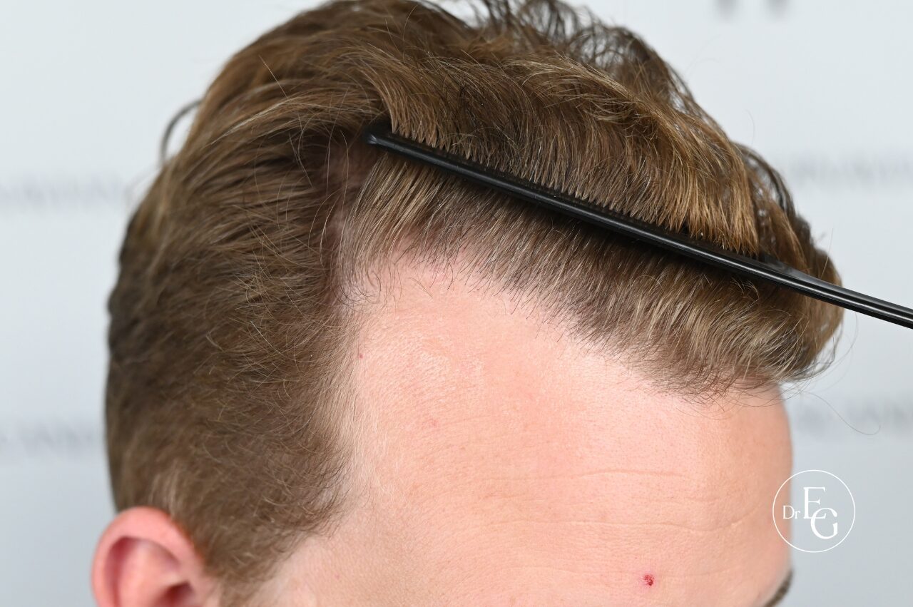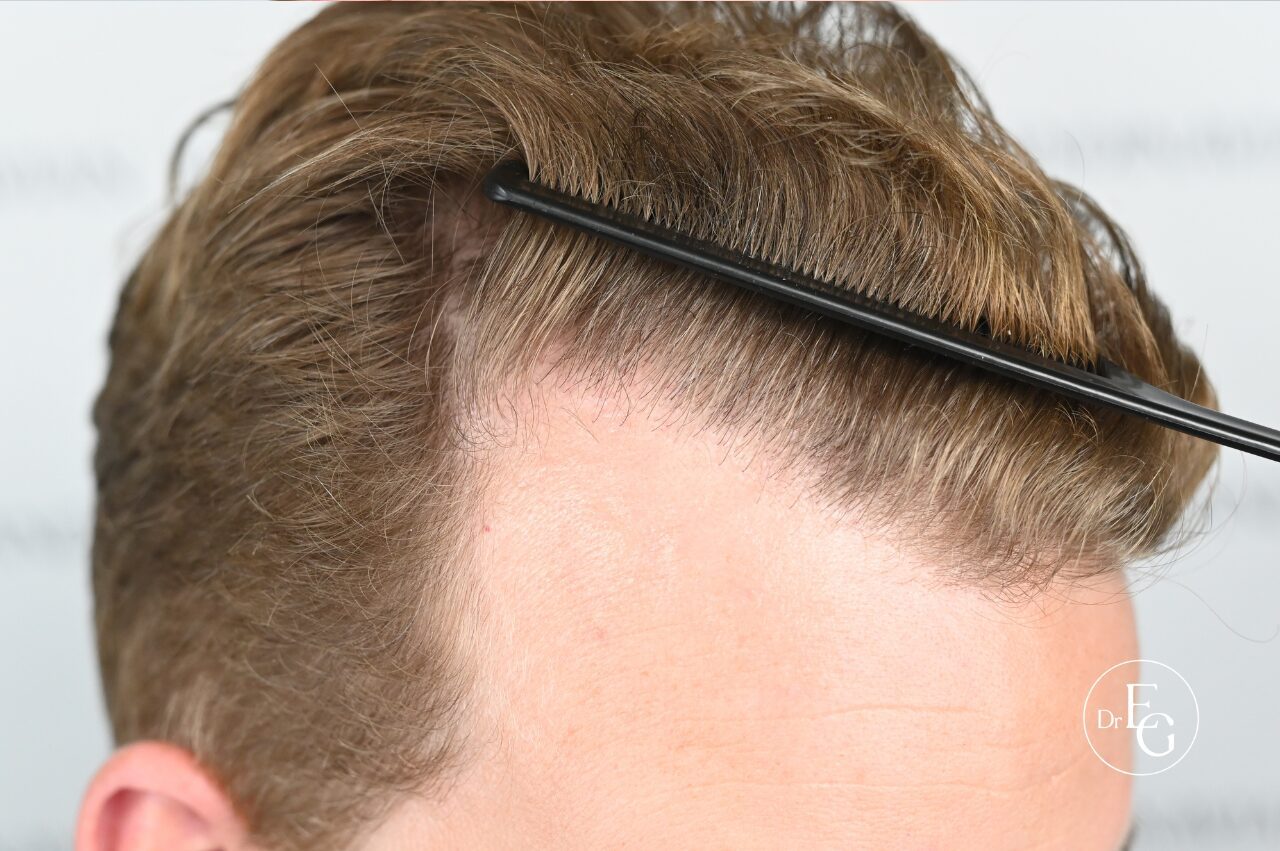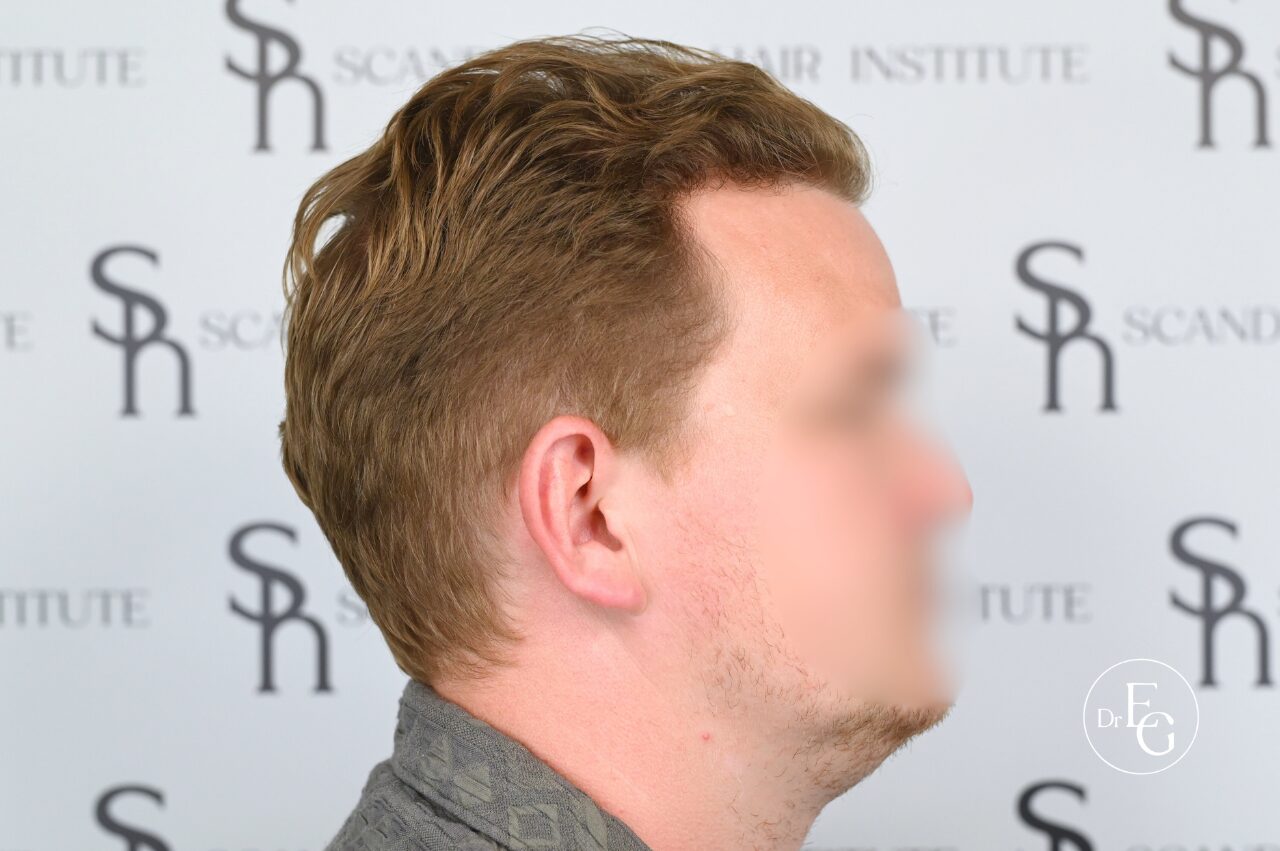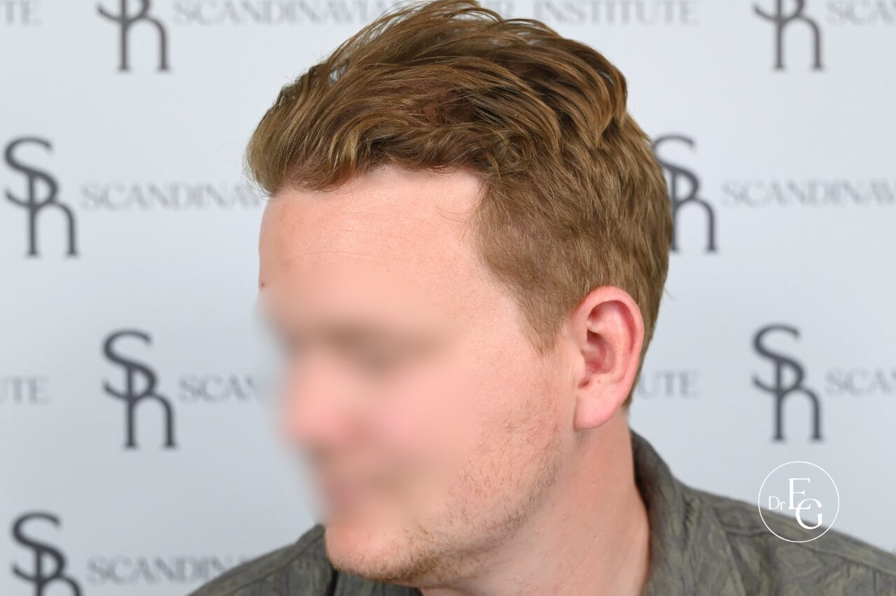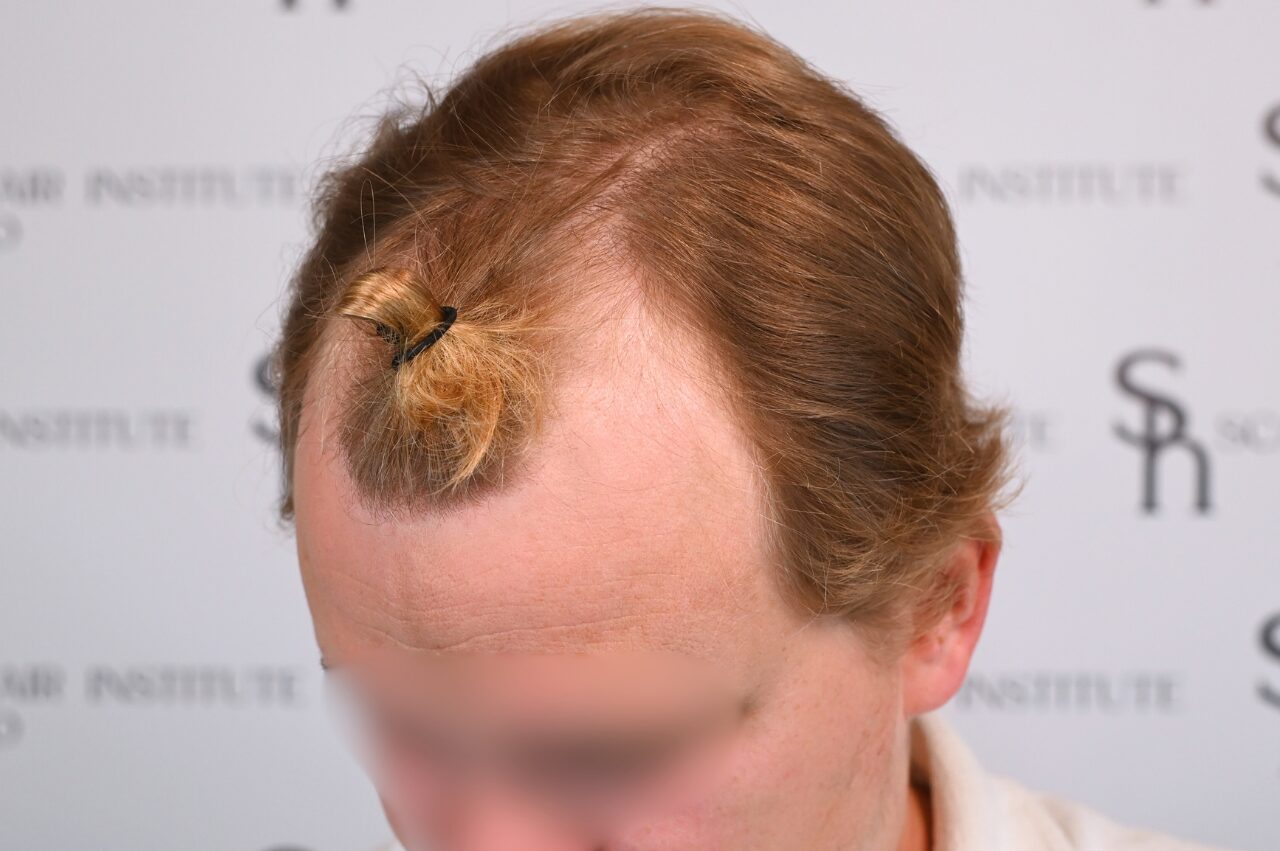 Blonde patient with deep temples, 2200 grafts, dry and wet hair.