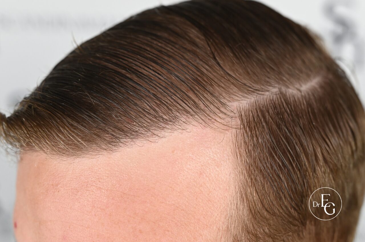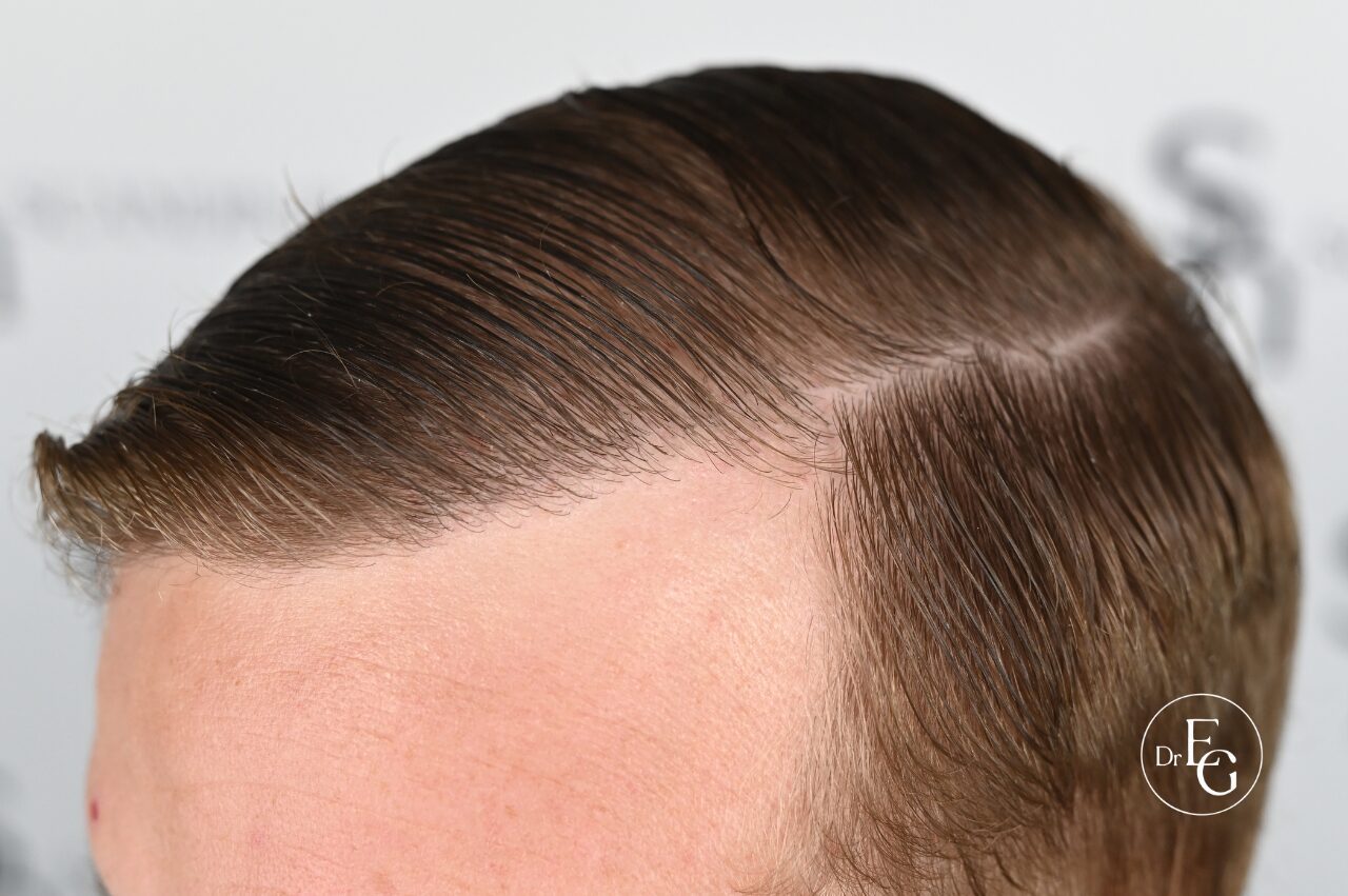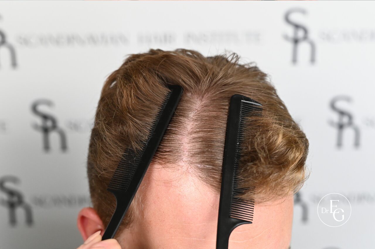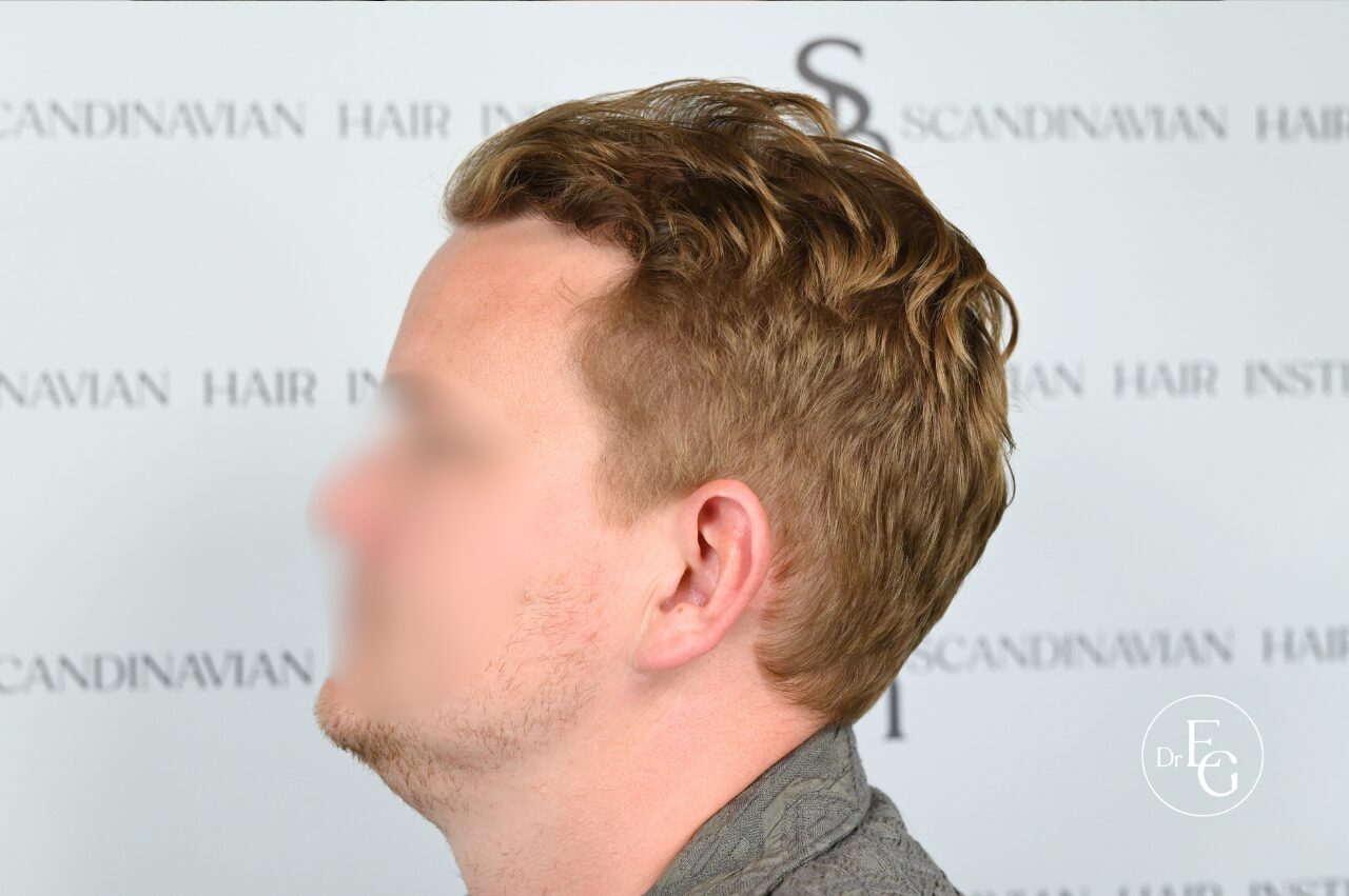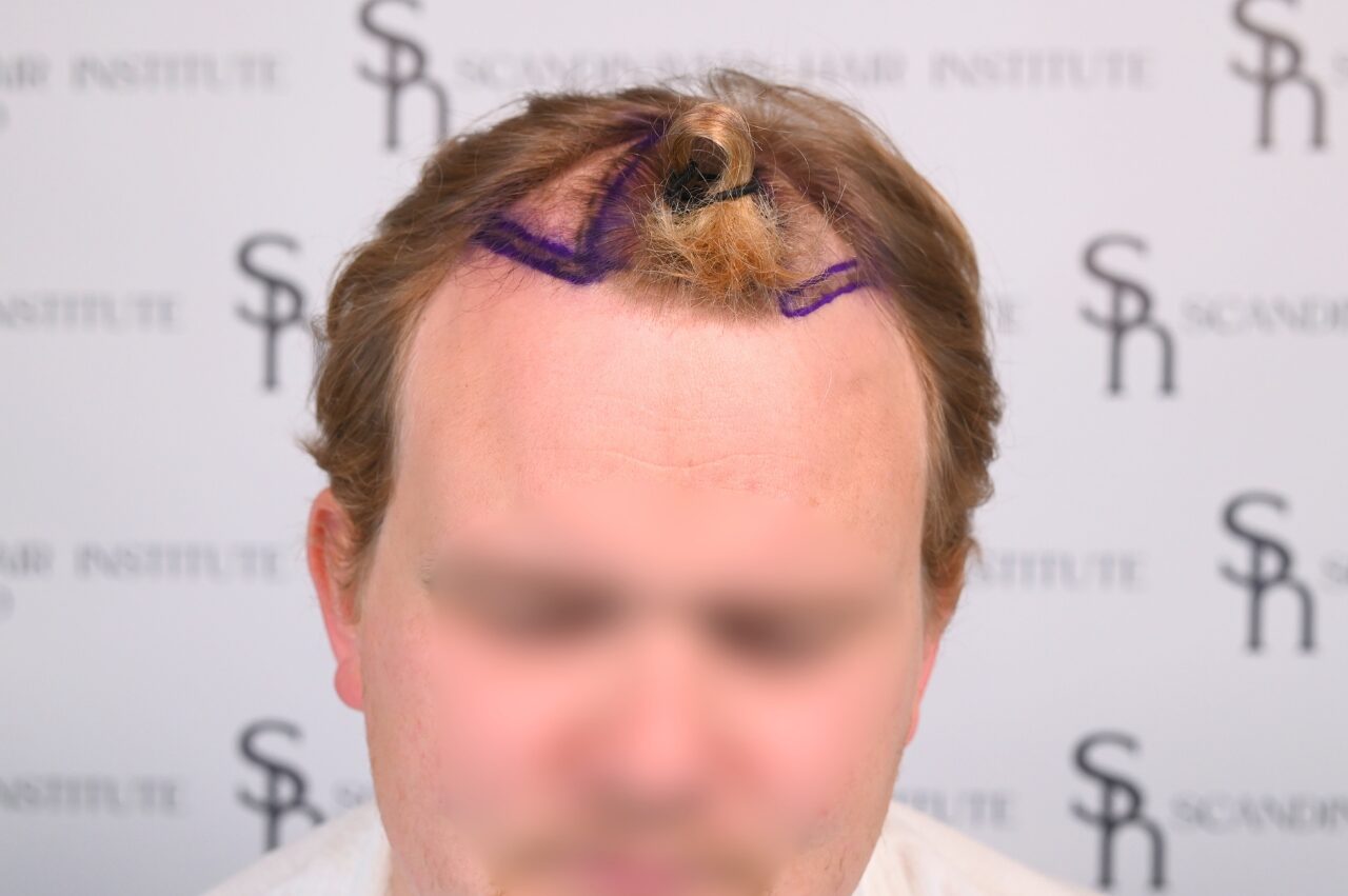 Blonde patient with deep temples, 2200 grafts, dry and wet hair.