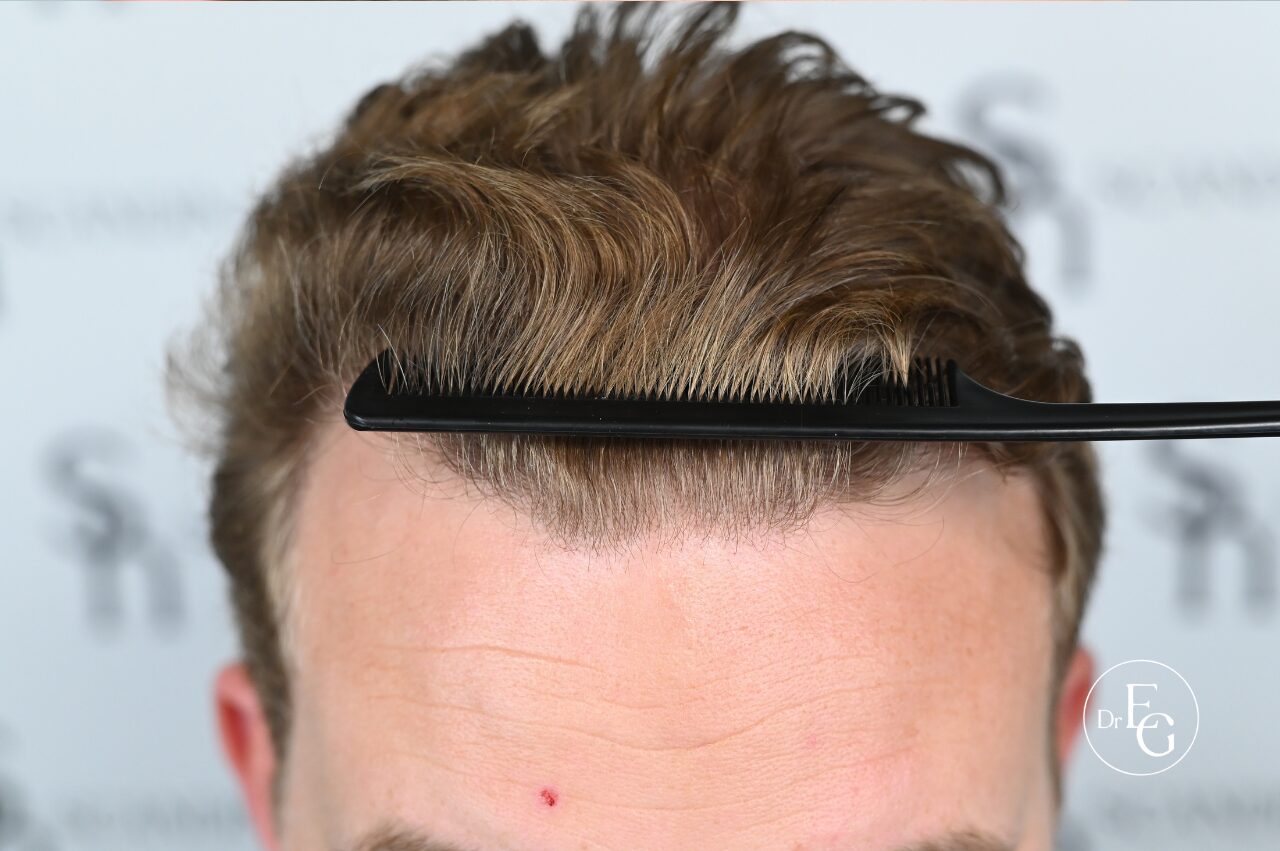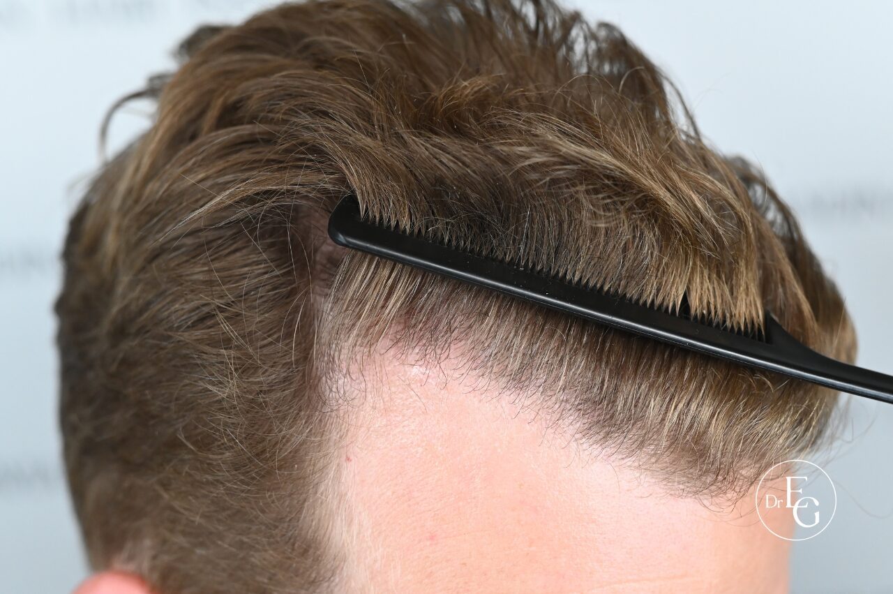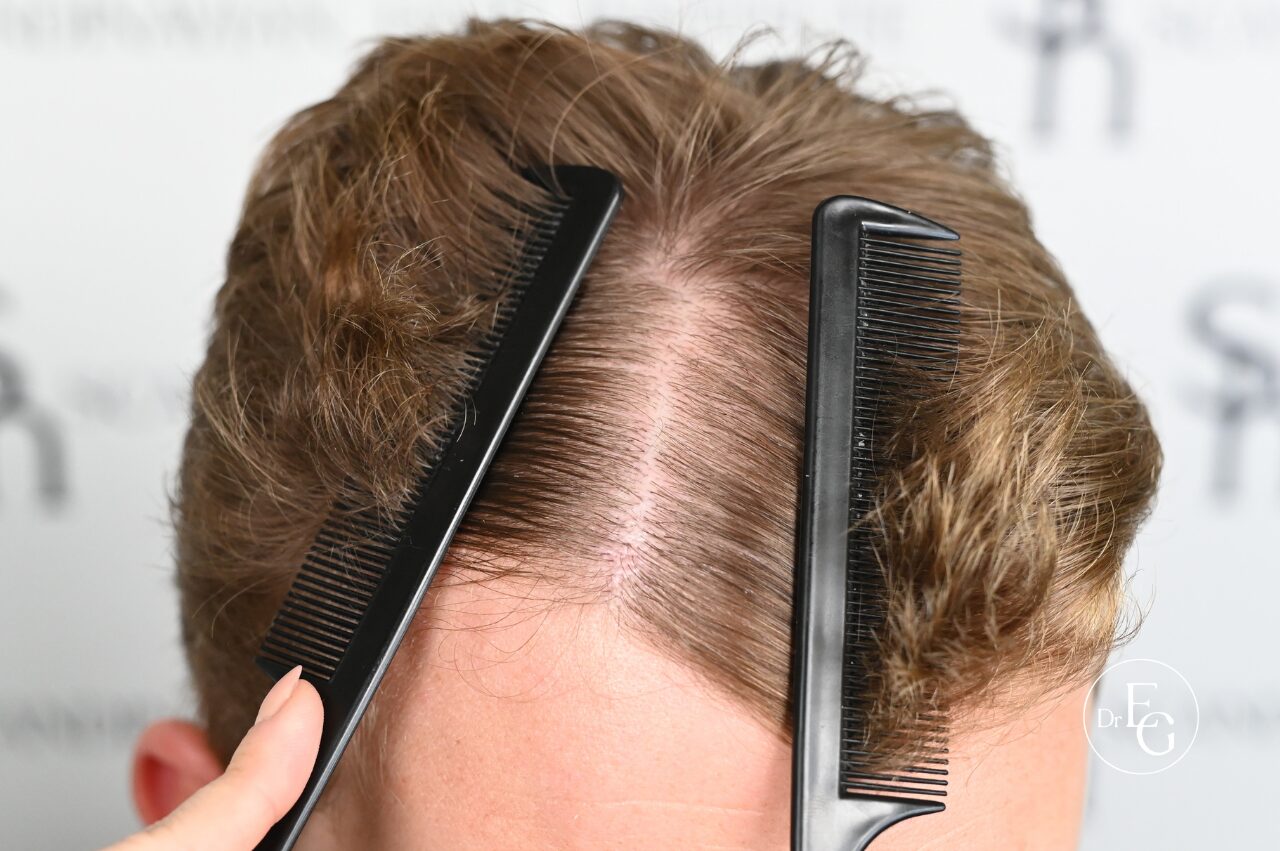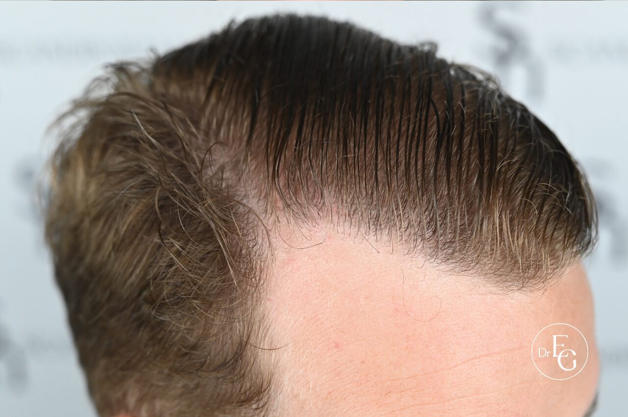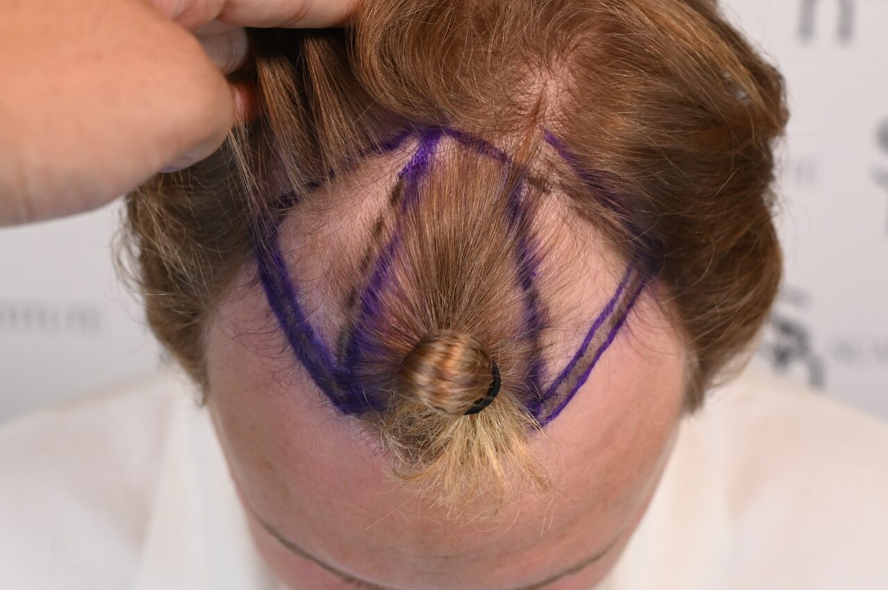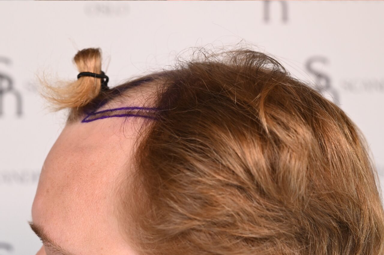 Blonde patient with deep temples, 2200 grafts, dry and wet hair.