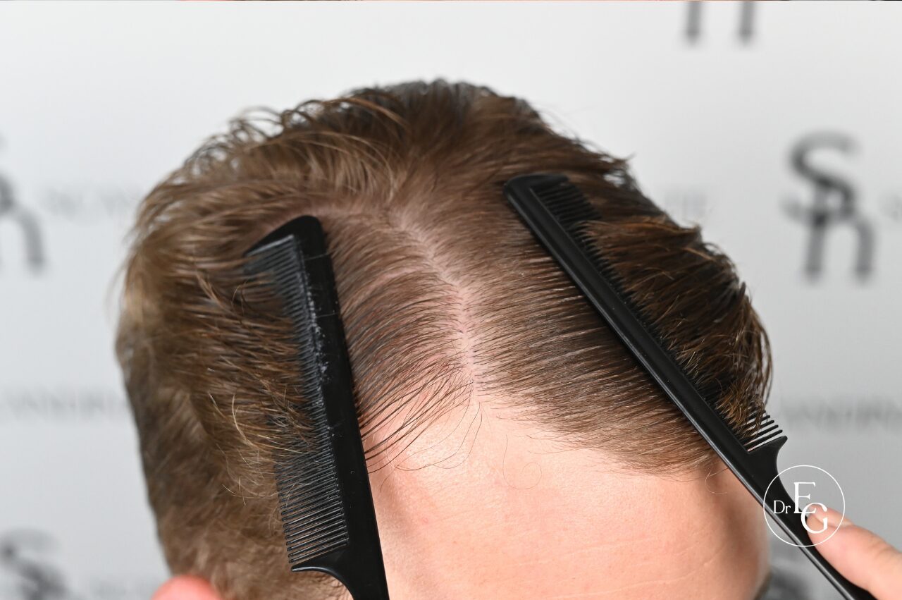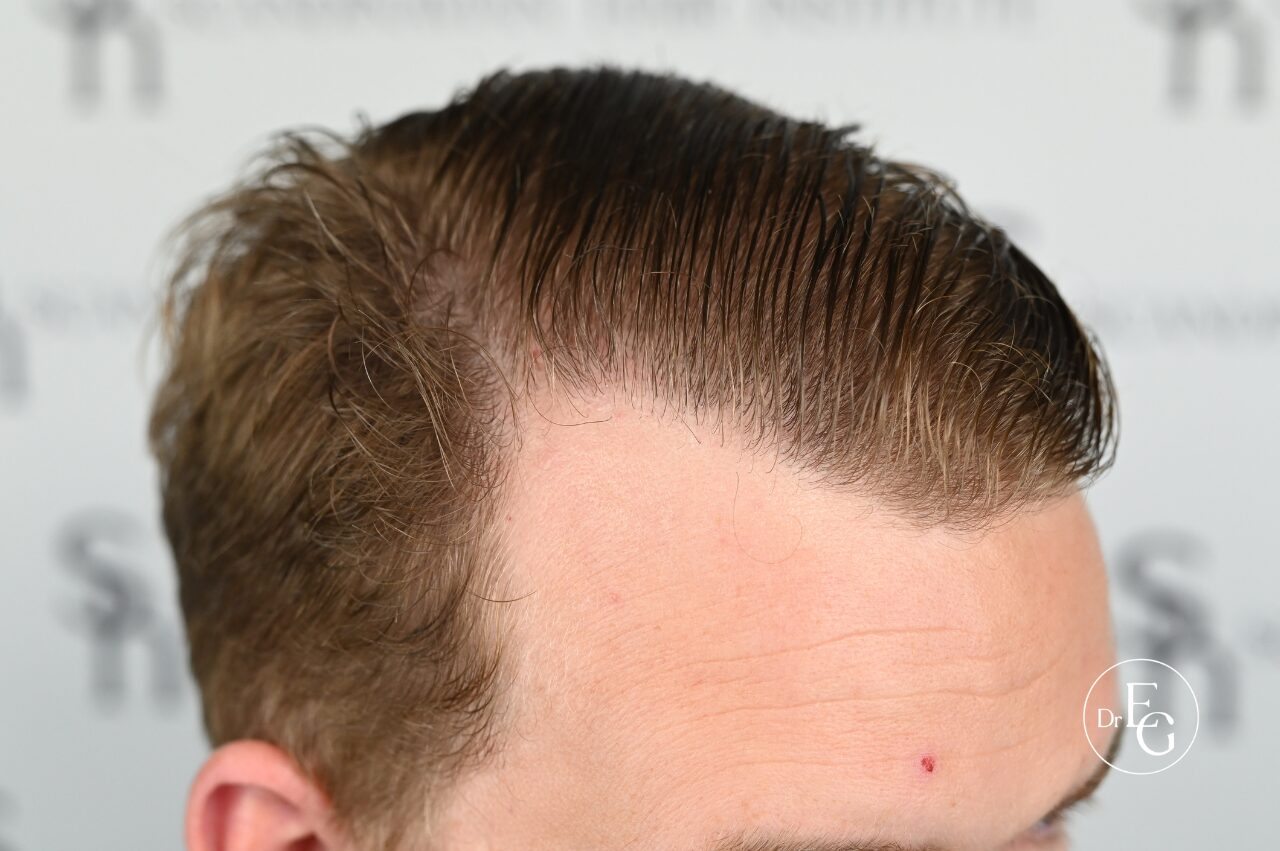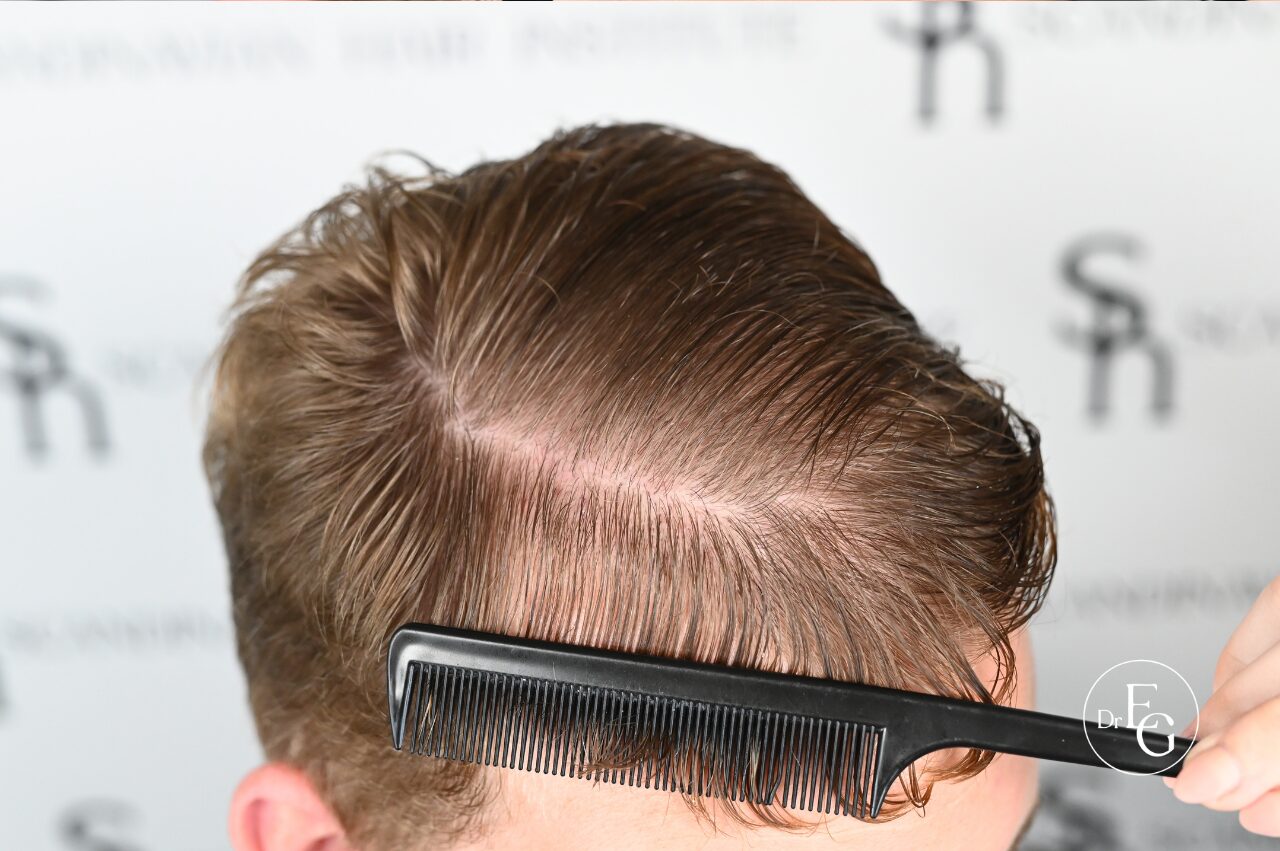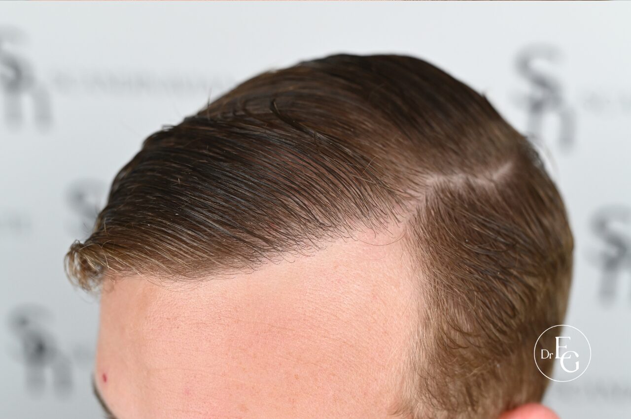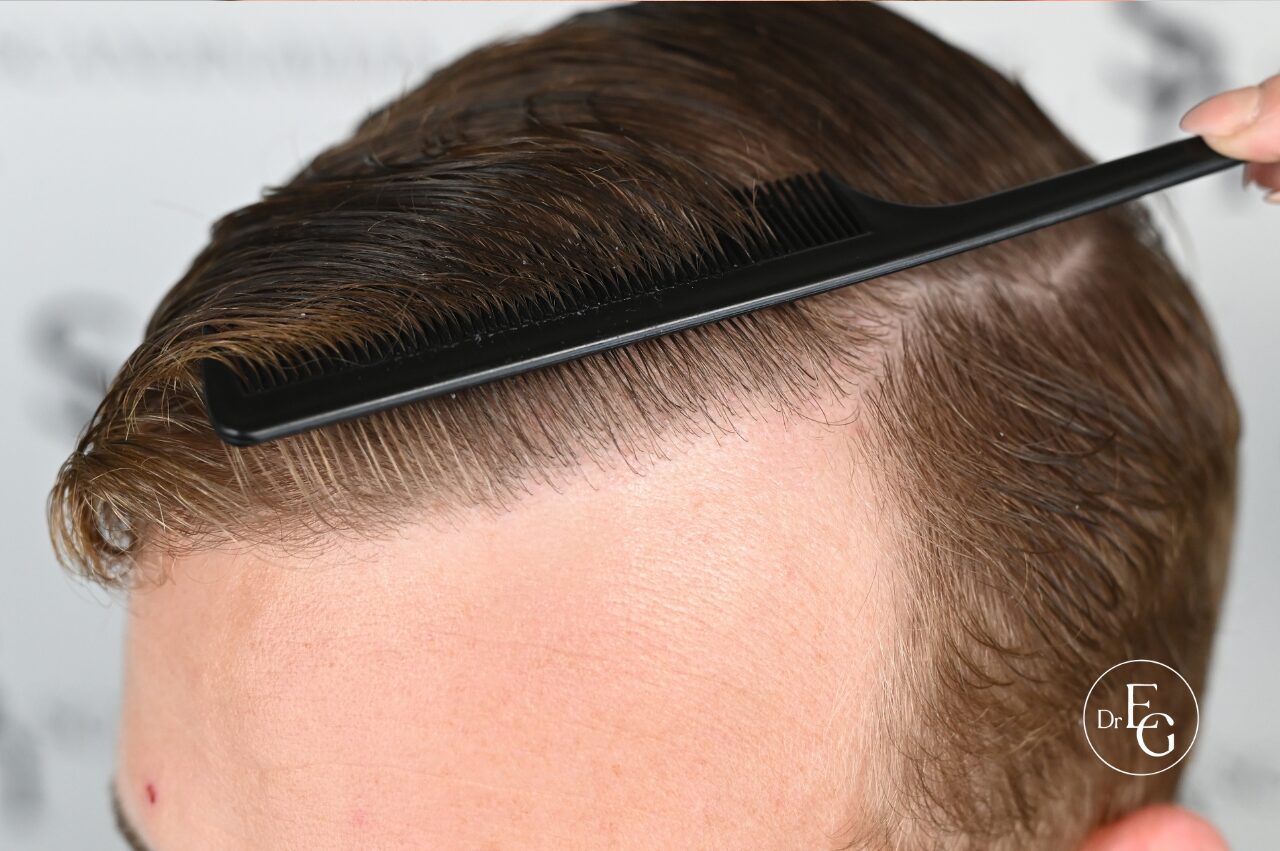 Blonde patient with deep temples, 2200 grafts, dry and wet hair.