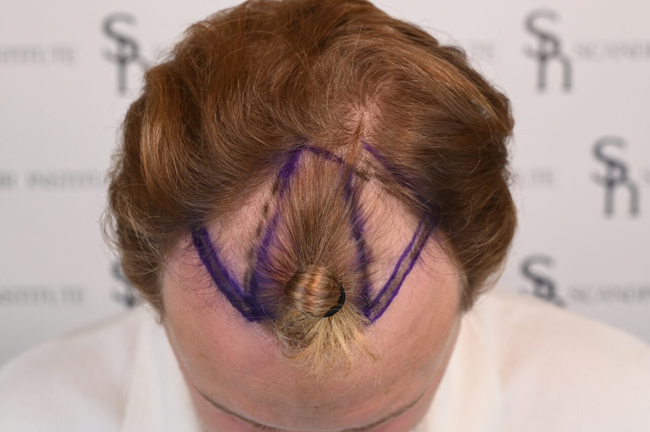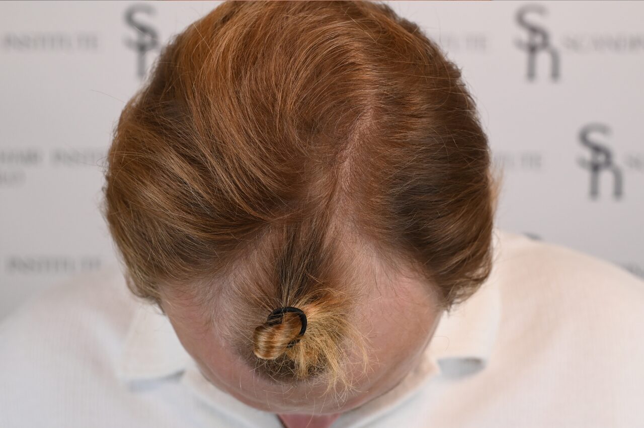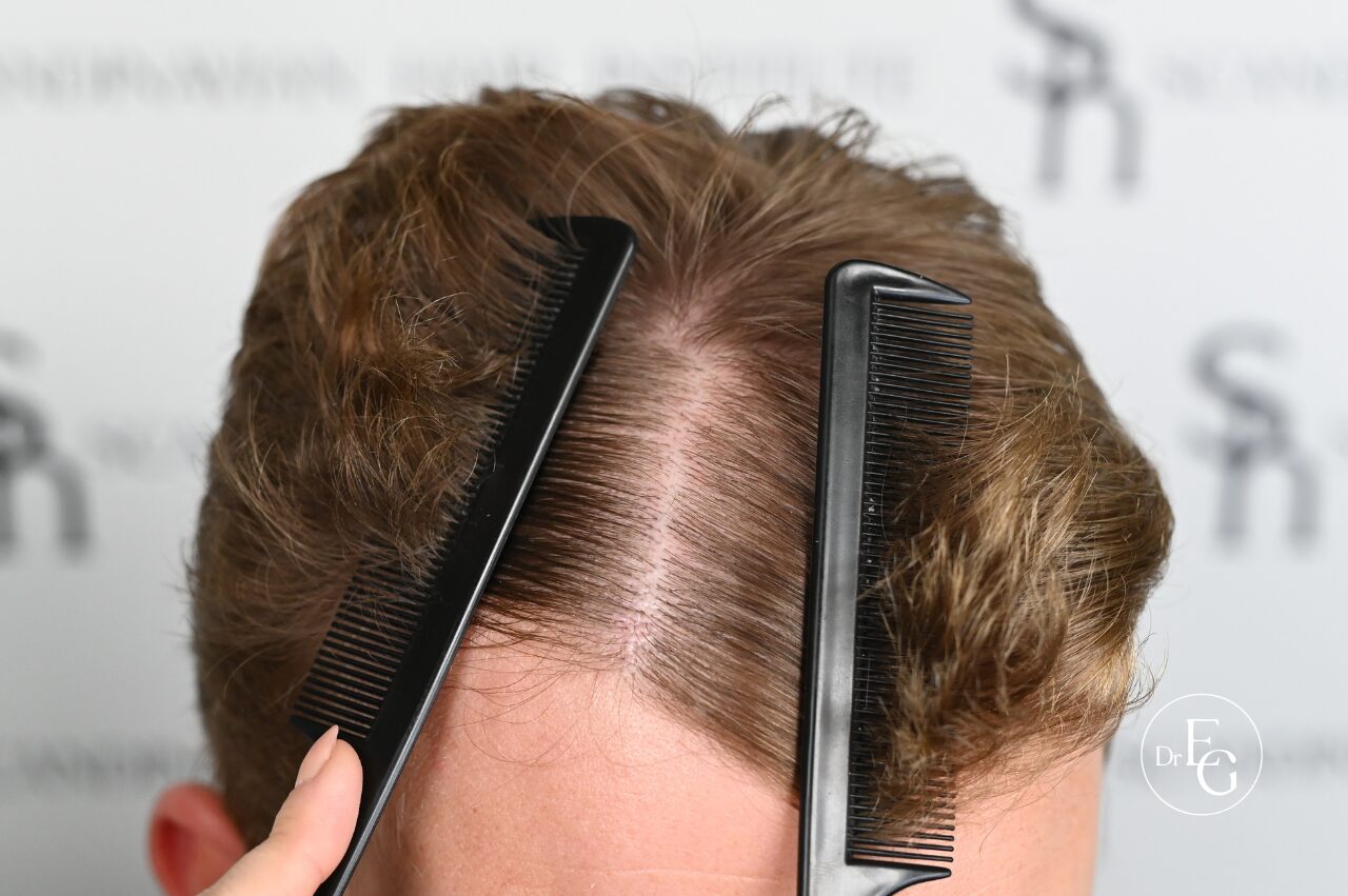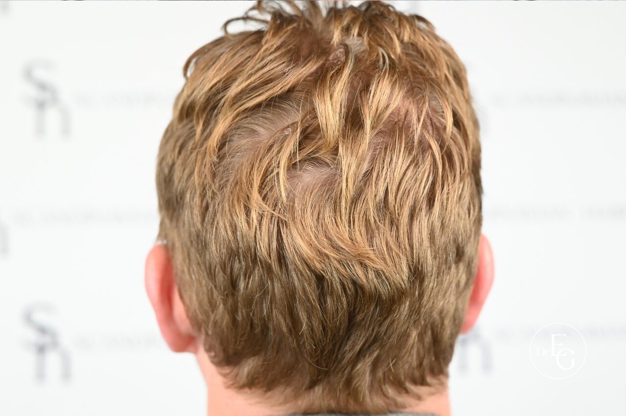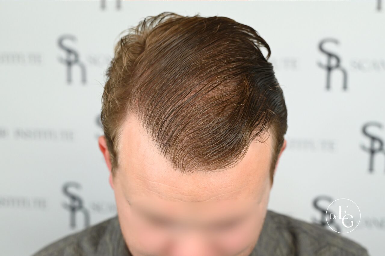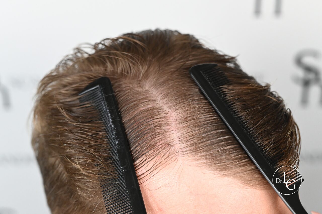 Blonde patient with deep temples, 2200 grafts, dry and wet hair.