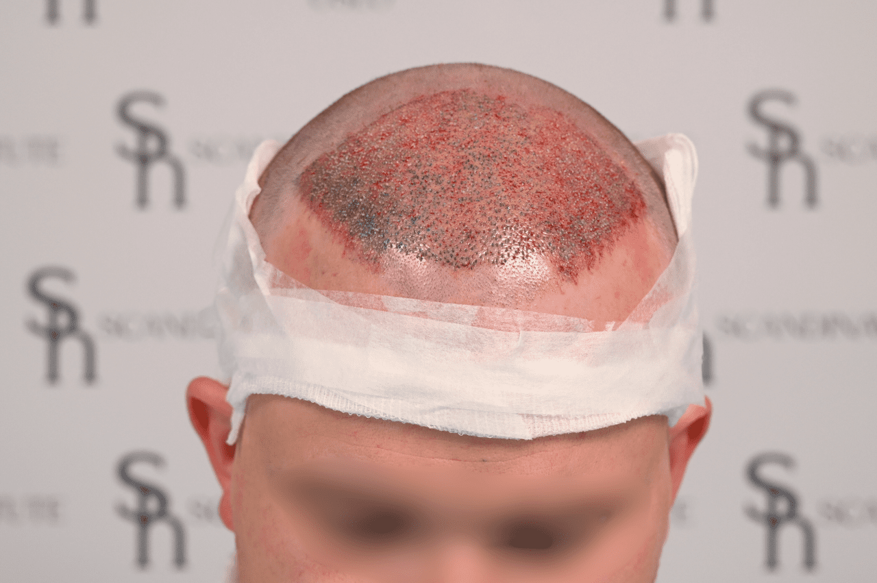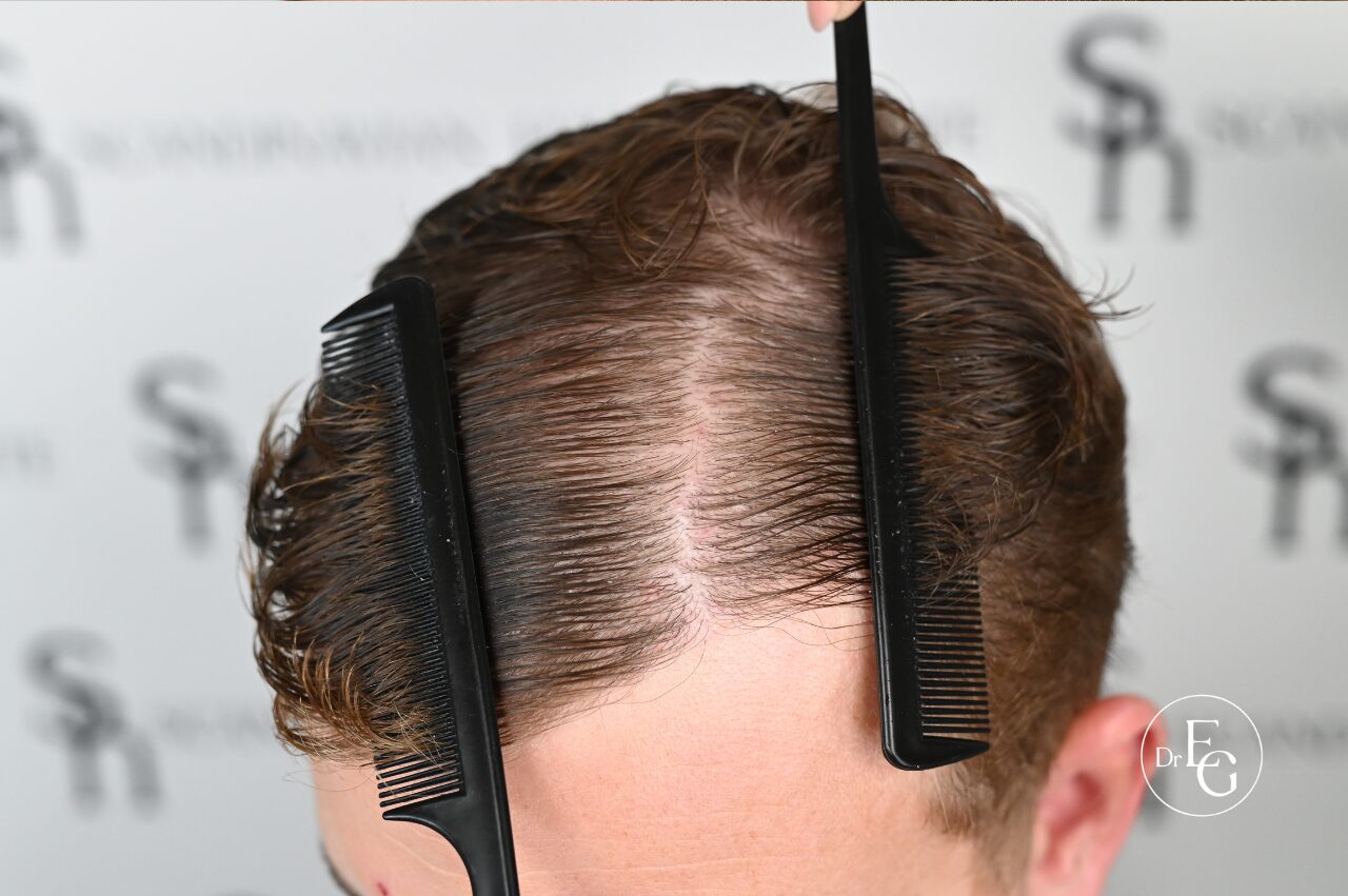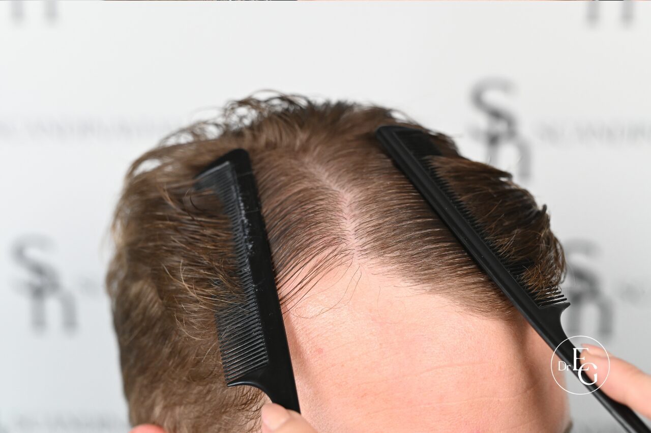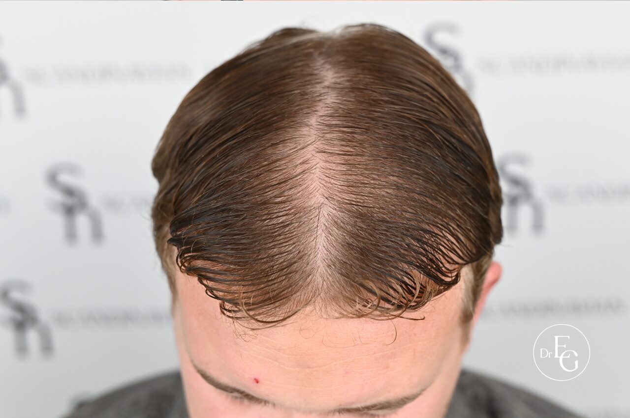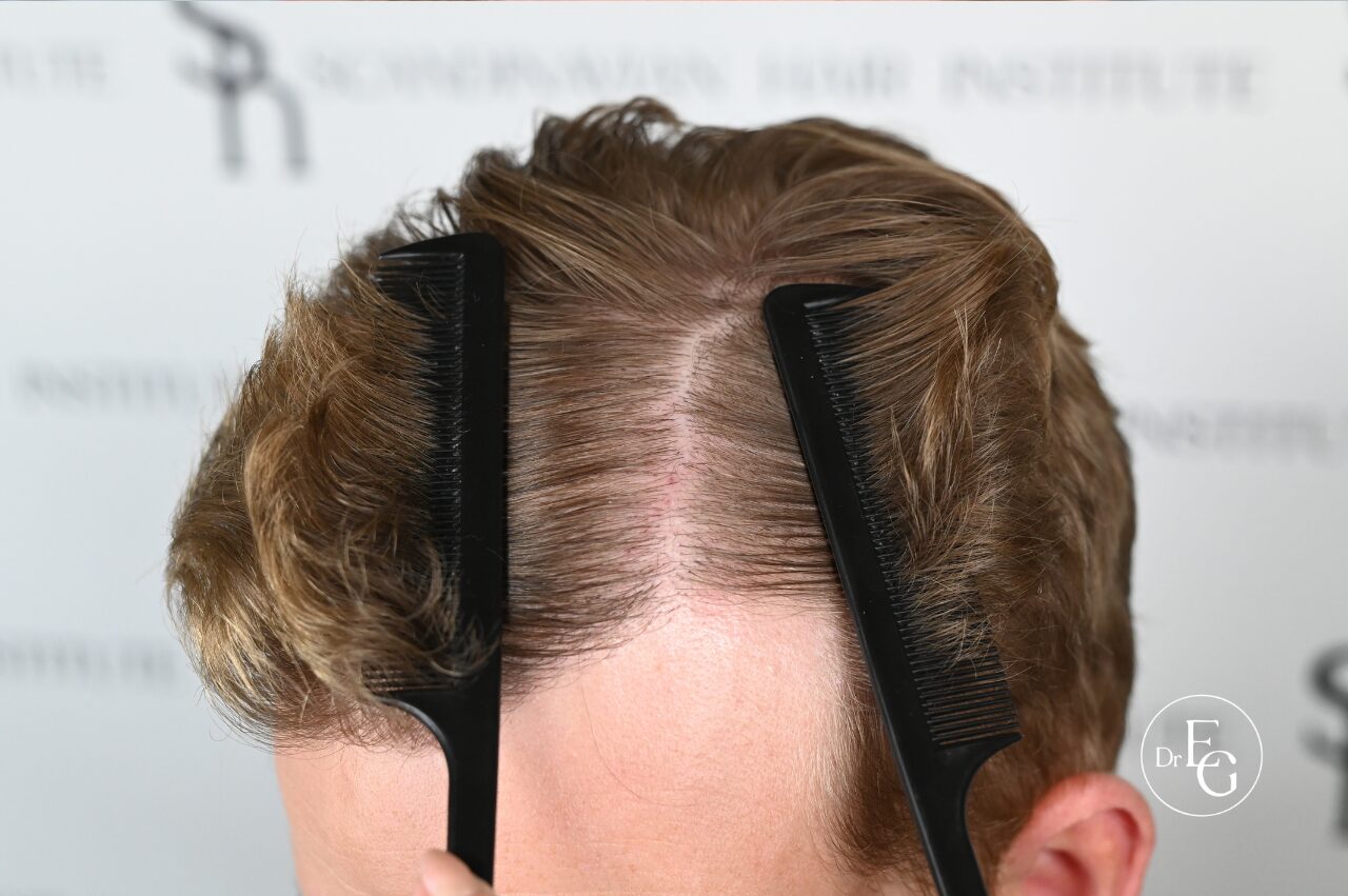 Blonde patient with deep temples, 2200 grafts, dry and wet hair.