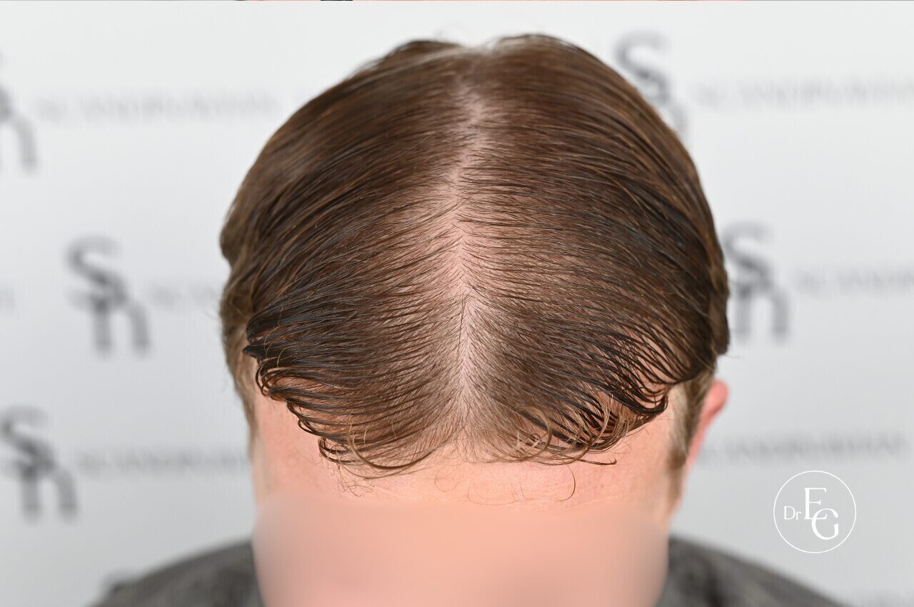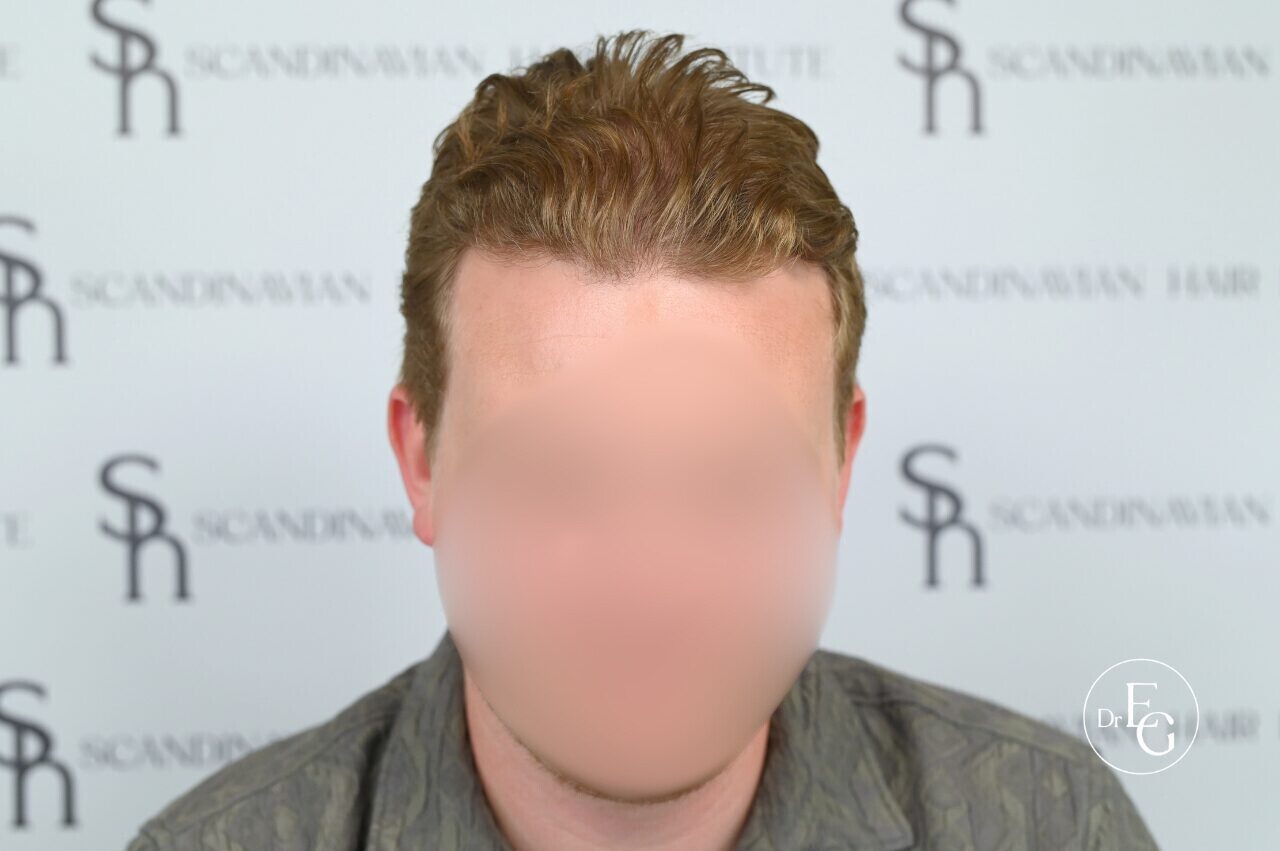 This case features a blonde patient with deep temporal recessions, restored using 2,200 grafts. Results are documented with both dry and wet hair to highlight the natural density and hairline integration.